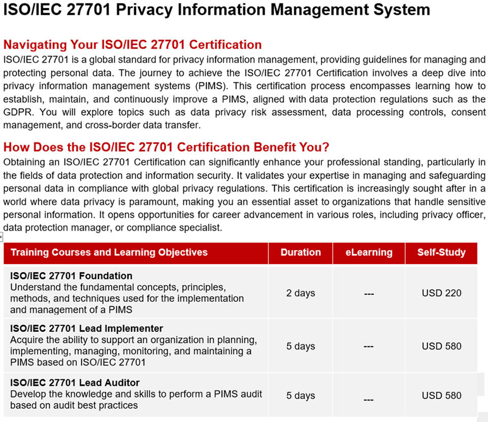 As a global provider of training, examination, and certification services, PECB offers its expertise on multiple fields, including, but not limited to, Information Security, Privacy and Data Protection, Business Continuity, Quality and Service Management, Risk Management, Health and Safety, and Sustainability.